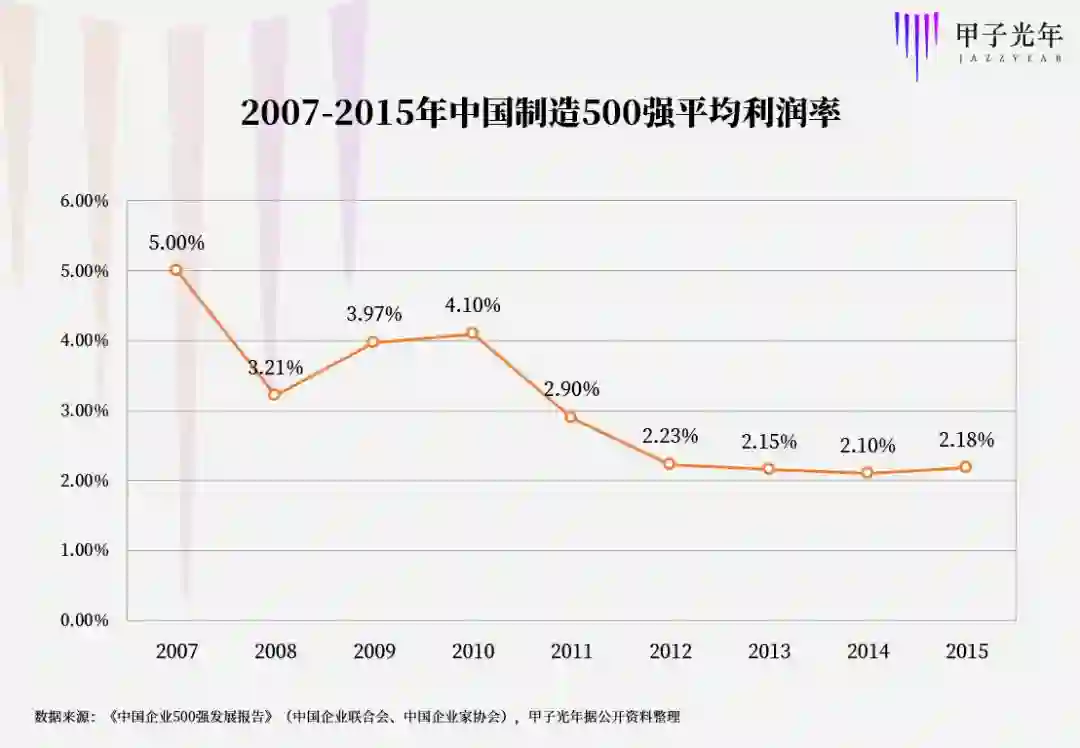 中国制造业500强的利润率已从2010年5%的高位,跌到了近年的2%左右。