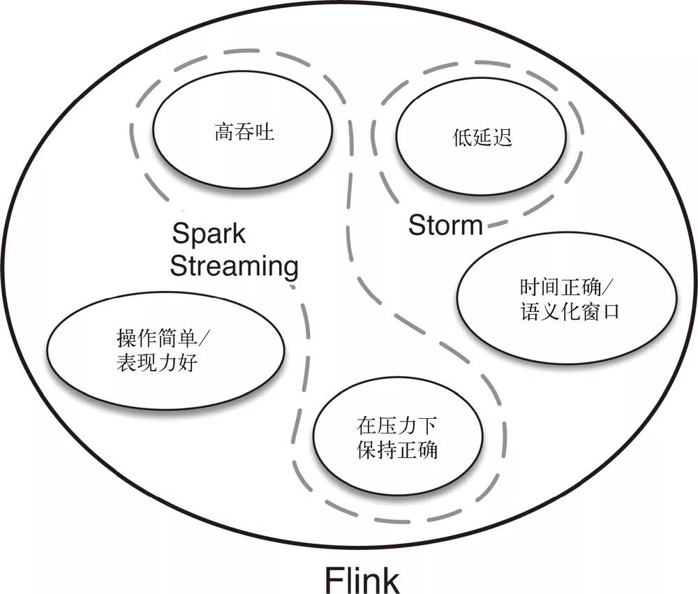 图 1-2:Flink 的一个优势是,它拥有诸多重要的流式计算功能。其他项目为了实现这些功能,都不得不付出代价。比如,Storm 实现了低延迟,但是在作者撰写本书时还做不到高吞吐,也不能在故障发生时准确地处理计算状态;Spark Streaming 通过采用微批处理方法实现了高吞吐和容错性,但是牺牲了低延迟和实时处理能力,也不能使窗口与自然时间相匹配,并且表现力欠佳