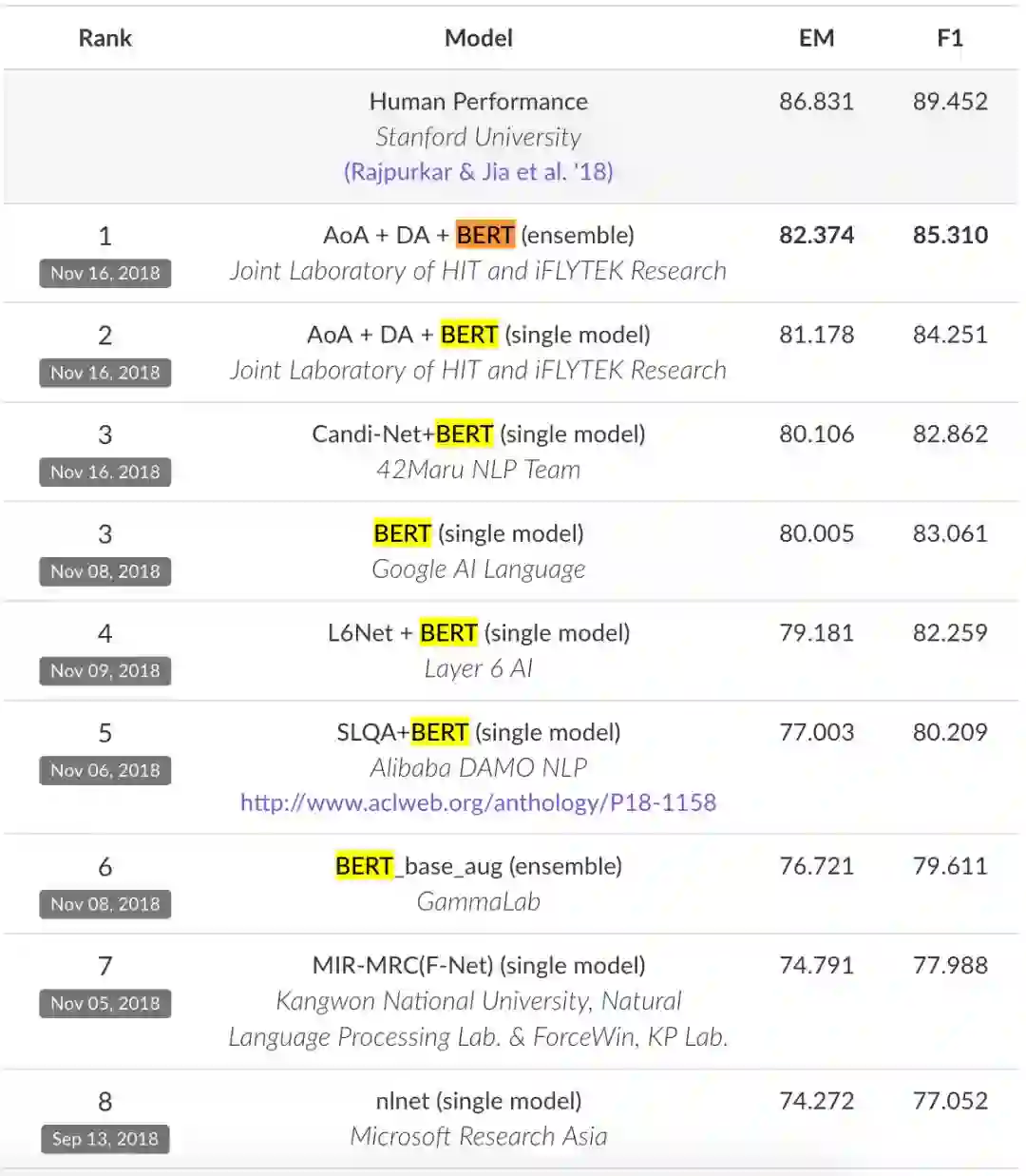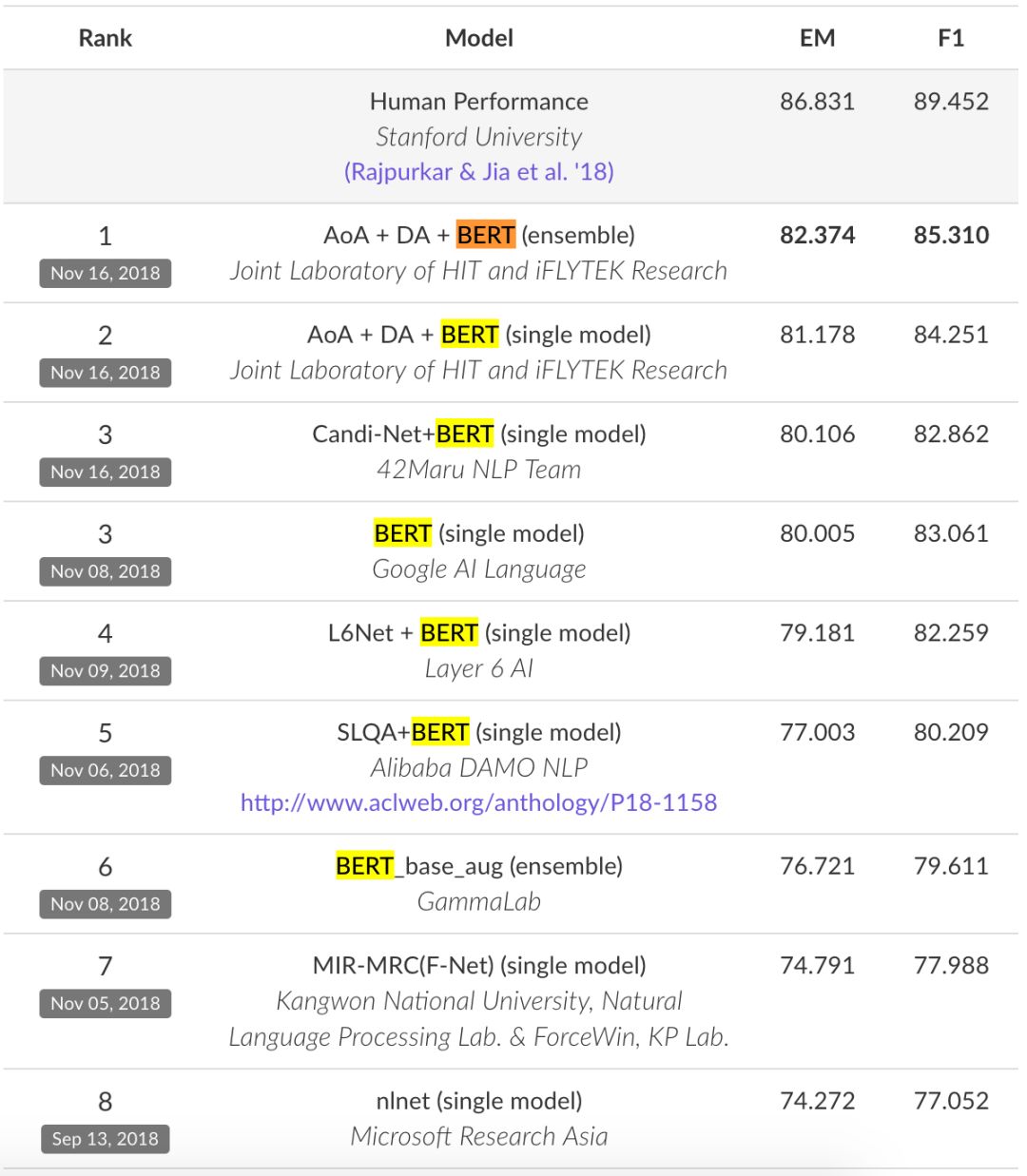 阿里巴巴达摩院 NLP 团队的 SLQA+BERT(单模型)系统;