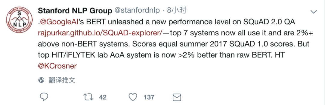 今日,机器之心小编在刷 Twitter 时,发现斯坦福自然语言处理组的官方账号发布了一条内容:谷歌 AI 的 BERT 在 SQuAD 2.0 问答数据集上取得了全新的表现。该账号表示,目前榜单上的前 7 个系统都在使用 BERT 且要比不使用 BERT 的系统新能高出 2%。得分等同于 2017 年 SQuAD 1.0 版本时的得分。此外,哈工大讯飞联合实验室的 AoA 系统要比原 BERT 高出 2% 左右。