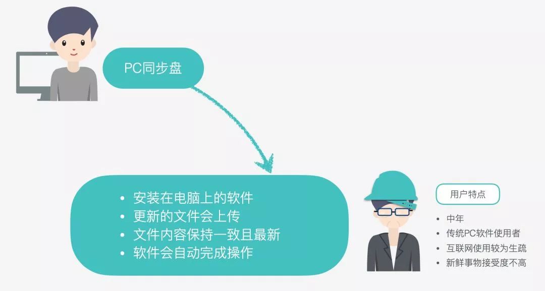 将这些内容写成可读的文案需要始终记得,需要站在用户的角度描述,要使用用户能懂的词汇,而非功能术语的简单堆砌。以市面上各大网盘的PC同步盘这个概念为例,当你需要向你的用户介绍这款软件时,你该怎么描述呢?特别是当目标用户是一个在传统行业执业多年又不太能接受新鲜事物的人。我们可能需要对这个词做拆分,直至用户能够在他的认知范围内明白。