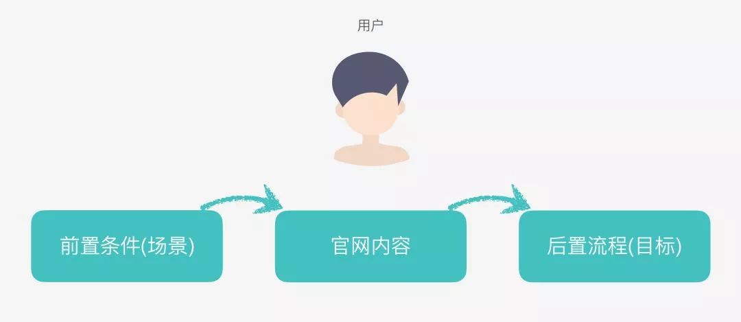 官网实际上是用户与产品的一个接触点,我们需要把官网内容放到一个完整的体验流程里来看。以下是一个非常粗略的用户体验路径。用户一定是在某些前置条件之后,开始访问官网。了解了官网的内容之后,接下来会有进一步的流程或者要达到的目的地。其实就是我们在平时工作中会思考的:一群怎样的用户在什么样的场景下访问官网,并最终要达到什么目标。