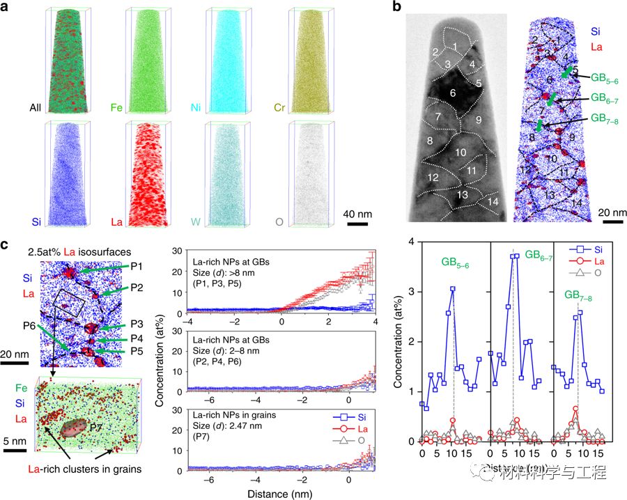 与普通的粗晶粒金属相比,纳米晶金属更强、更抗辐照。但是,纳米晶金属的热稳定性通常较差,致使其高温加工成型及应用受到很大的限制。沈同德教授课题组及其国内外合作团队综合利用稀土镧元素的掺杂以及高温高压合成技术,开发出块体纳米晶/纳米析出304L奥氏体钢,纳米晶粒尺寸约40纳米,纳米析出尺寸约5纳米,纳米析出密度高达5´1023m-3。