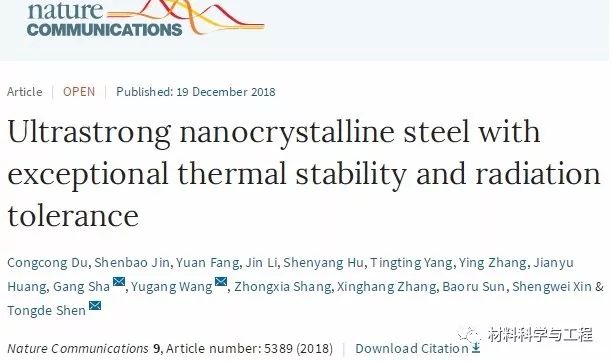 近日,燕山大学亚稳材料制备技术与科学国家重点实验室清洁纳米能源中心沈同德教授团队与国内外科学家合作,针对奥氏体钢强度偏低、辐照后易肿胀以及纳米晶金属高温下晶粒易长大等问题,创新性的通过界面元素偏聚及纳米析出钉扎,制备出超强且具有优异的热与辐照稳定性的块体304L纳米晶奥氏体钢,相关研究成果于2018年12月19日在线发表于Nature Communications。