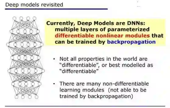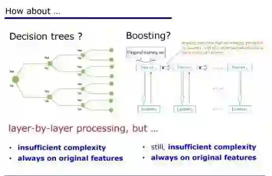 那么,有没有可能做出合适的深度模型,在这些任务上得到更好的性能呢? 我们从学术的观点来总结一下,今天我们谈到的深度模型基本上都是深度神经网络。如果用术语来说的话,它是多层、可参数化的、可微分的非线性模块所组成的模型,而这个模型可以用 BP 算法来训练。 那么这里面有两个问题。第一,我们现实世界遇到的各种各样的问题的性质,并不是绝对都是可微的,或者用可微的模型能够做最佳建模的。第二,过去几十年里面,我们的机器学习界做了很多模型出来,这些都可以作为我们构建一个系统的基石,而中间有相当一部分模块是不可微的。 现在我们遇到了这样一个大挑战,可不可以用不可微的模块构建深度模型?这不光是学术上的,也是技术上的一个挑战,就是我们能不能用不可微的模块来构建深度模型? 这个问题一旦得到了回答,我们同时就可以得到很多其他问题的答案。比如说深度模型是不是就是深度神经网络?我们能不能用不可微的模型把它做深,这个时候我们不能用 BP 算法来训练,那么同时我们能不能让深度模型在更多的任务上获胜?