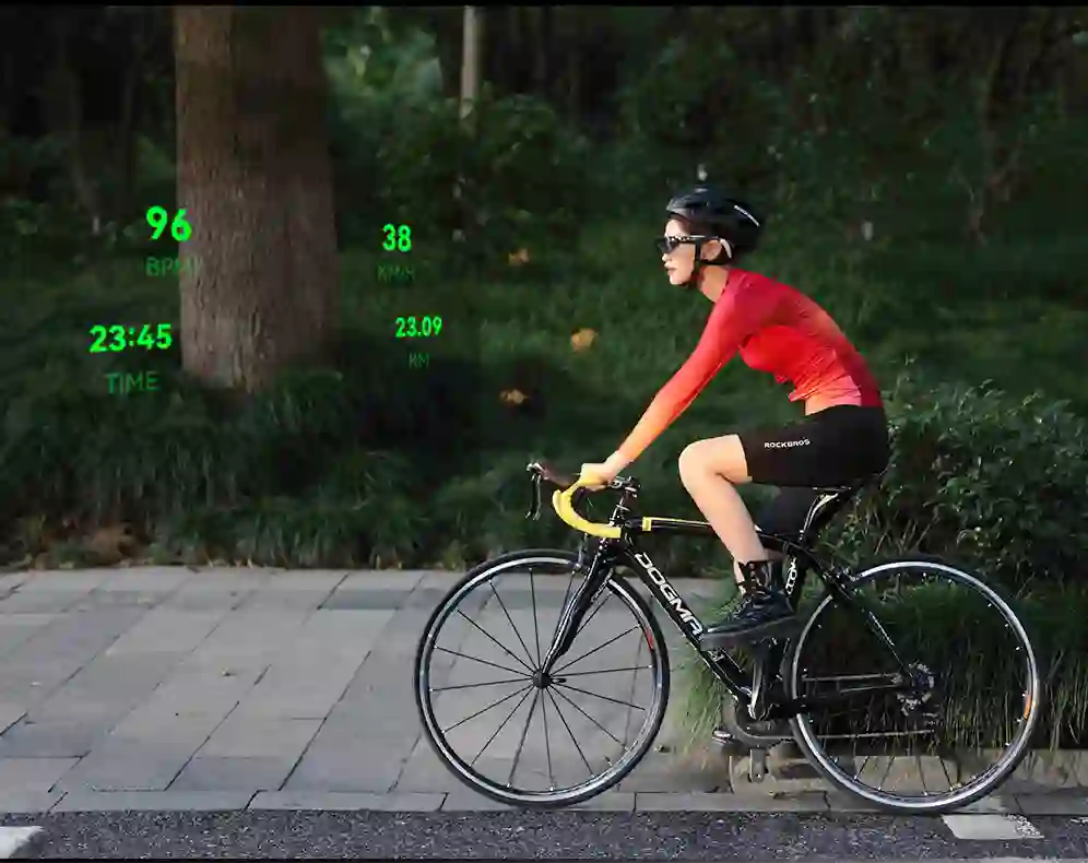 而AR眼镜的最大优势即在于此。以运动类AR眼镜主打的骑行场景为例,无论是手机、码表还是运动手表,骑行者都需要分神查看数据,存在一定安全隐患。而AR眼镜可以提供类似于汽车HUD(抬头显示)的显示画面,让骑行者在保持注意力的同时,获得自己的配速、位置、导航、心率等信息,更专注于运动之中。
