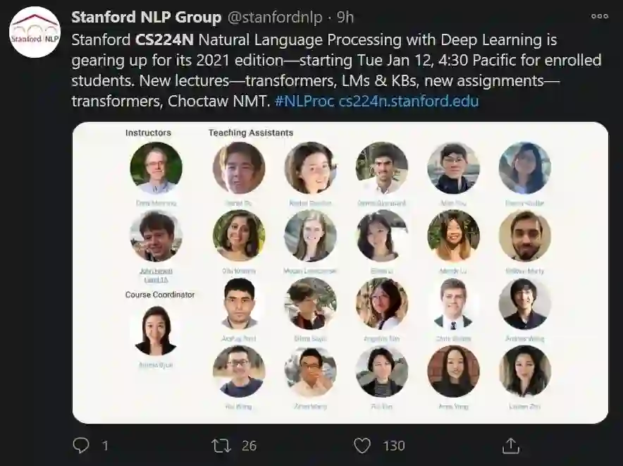 斯坦福大学 CS224N 深度学习自然语言处理 2021 冬季课程即将开课!