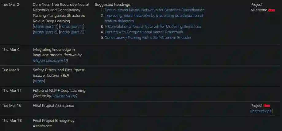 在 3 月份的课程安排中,学生将学习到卷积神经网络(ConvNet)、基于树形结构的 RNN、深度学习中选区解析和语言结构扮演的角色、语言模型中的知识集成、安全 & 伦理 & 偏见以及 NLP 和深度学习的未来发展等。