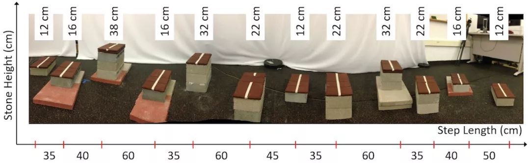 图:ATRIAS双足机器人用不同的步长和步高在随机离散地形上行走