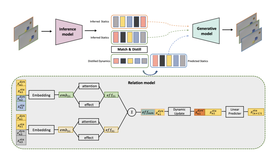 结合编码器编码的物体静态物理属性以及蒸馏网络蒸馏得到的物体动态物理属性,显式的建模物体对之间的交互作用以更新每个物体的动态表示。每个物体更新后的动态表示和静态表示预测下一帧的物体状态并解码为下一帧图像。