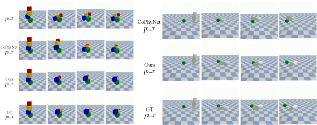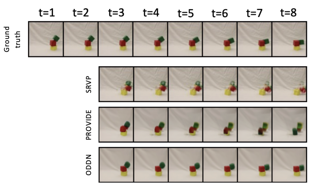 此外,ODDN 显式建模了物体间的交互,结合生成模型,赋予了模型直接预测未来视频帧的能力。团队在 CLEVRER 以及 Real Tower 数据集上做了视频预测的实验,结果表明在多物体场景 ODDN 的预测精度优于现阶段其他方法,尤其是包含物理事件 (碰撞、相互作用力) 的场景。