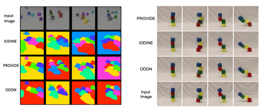 相比于 Baseline 模型,ODDN 最核心的改进是引入了的物体运动相关的线索,这不仅使得模型在其场景表征以及视频预测能力获益,还改善了其图像重建以及自监督分割的性能,主要表现在物体与物体之间分的更开,细节刻画更为精细。