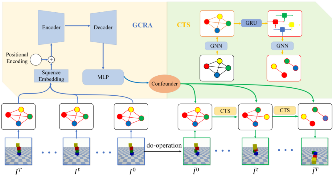 对此,团队研究了物理动力学中的混杂影响因子,包括质量、摩擦系数等,建立干预变量和未来状态可能改变变量之间的关联关系,提出了一种包含全局因果关系注意力(GCRA)和混杂因子传输结构(CTS)的神经网络框架。