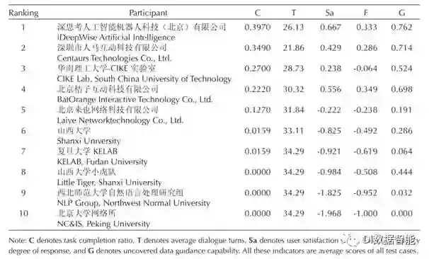图2中的结果是优先根据任务完成率指标,然后再考虑平均话轮数给出的综合排名,其中任务完成率C、用户满意度Sa、回复流畅度F和未覆盖数据应道能力G为人工完成标注,每个系统都有三位评测员针对21个特定任务进行评测打分,最终的任务完成率为三位评测员打分的均值。