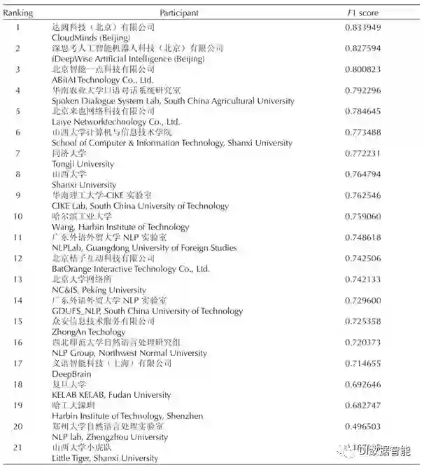 在提交的系统中,我们发现今年参赛系统前五名的平均F值(0.8079)要比去年(0.9268)低,经过我们分析,主要原因是今年的测试集是全新的,与发布的训练集和开发集不在同一分布,而去年的测试集是从训练集中抽出来的,所以今年综合的评分要比去年低很多。