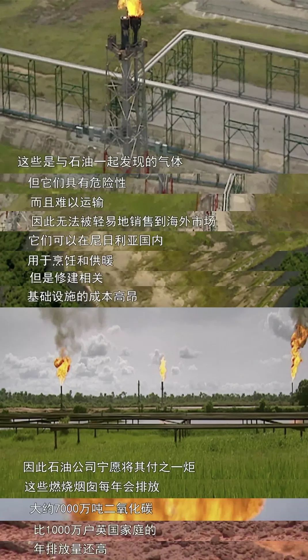 遍布尼日尔河三角洲的天然气燃烧烟囱日夜不停地燃烧,明明可供当地居民使用的天然气只因无法运走卖掉,石油公司又不愿意花钱兴建提炼设施给当地人使用,就眼睁睁被烧掉,一边还在释放有害气体。