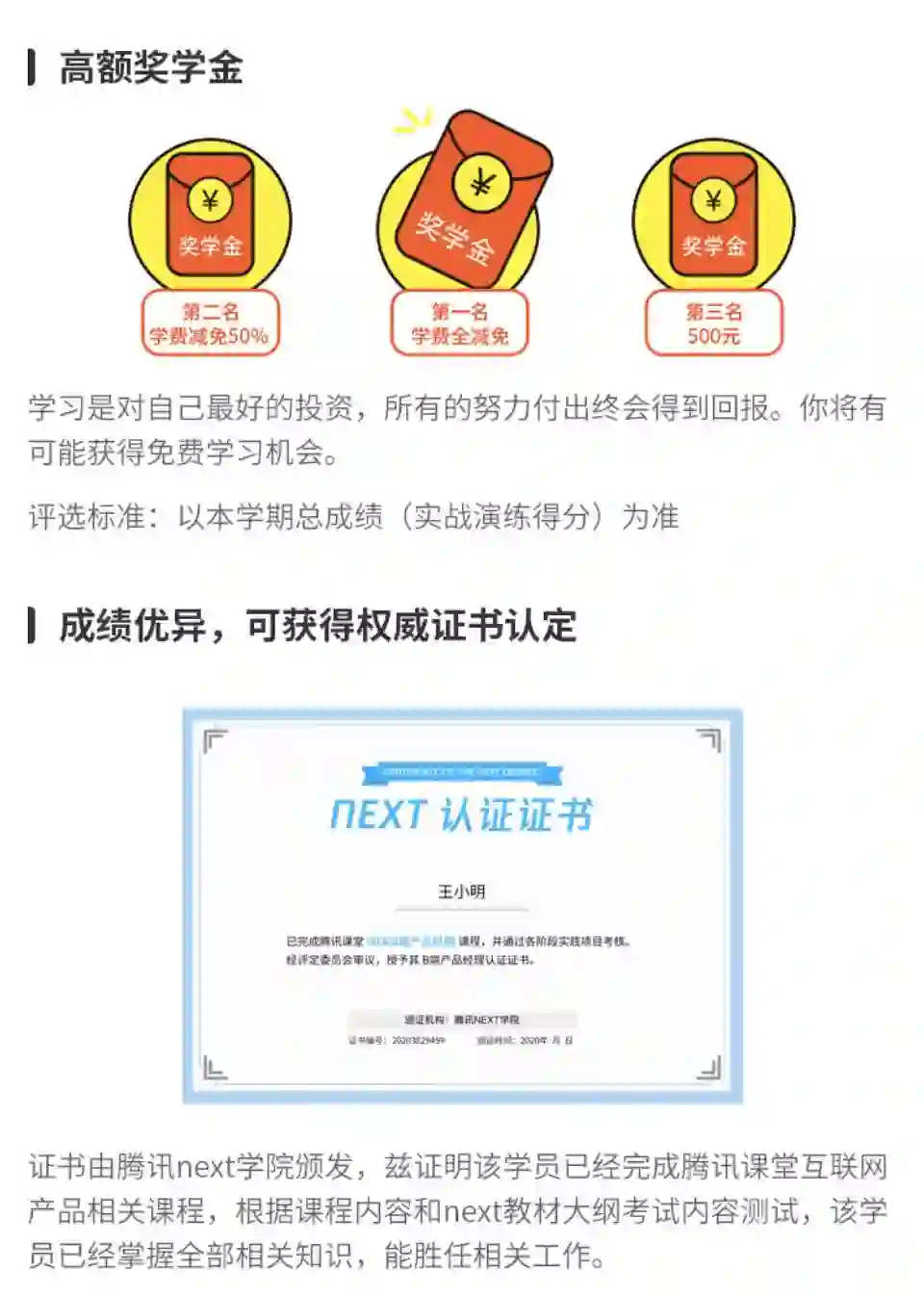 因此本课程还特别申请了高额奖学金,并得到合作伙伴“腾讯课堂Next”学院的认可。