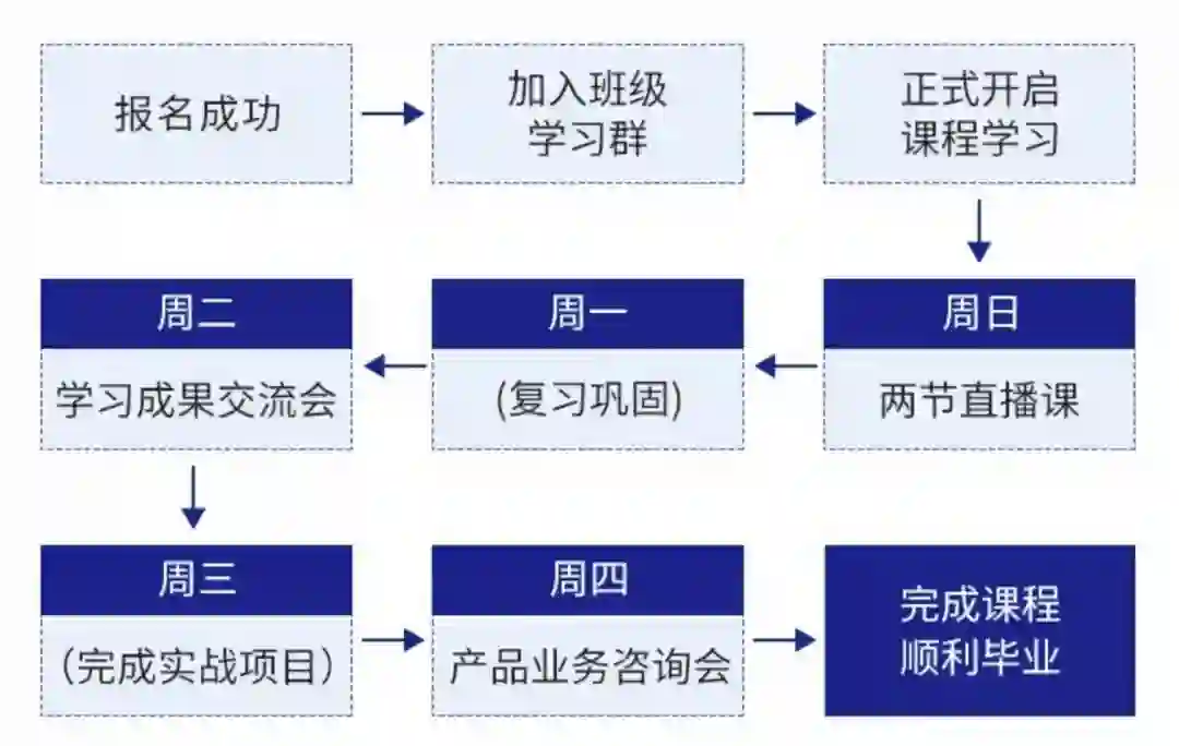 全程直播授课+12场产品业务咨询会+12场学习成果交流会+微信班级群交流;全程由班主任和助教带班,老师全程教学辅导。详细学习流程如下: