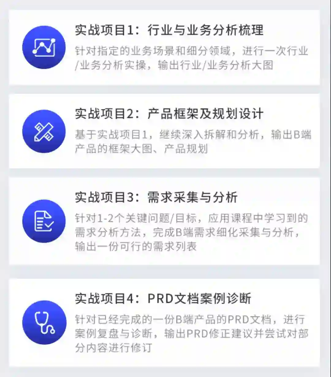 在这个课程中,针对B端产品经理的核心技能模块,你除了日常的基础学习外,还需要依据内容完成如下实操项目,加强知识的内化吸收。