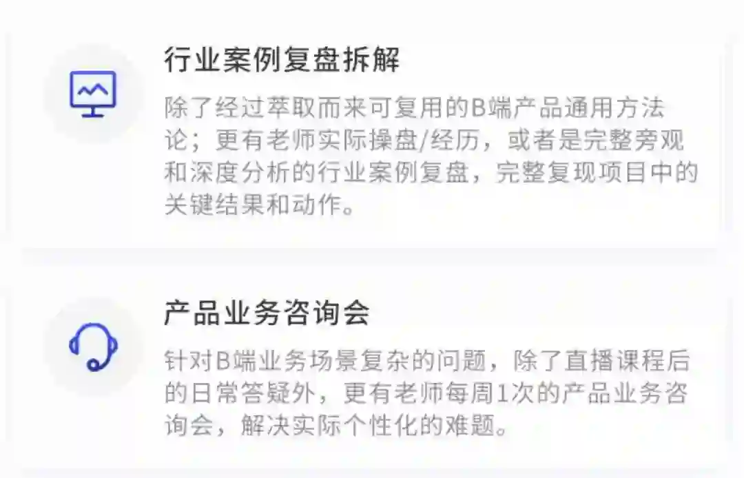 知其然更知其所以然,除了配合课程核心方法论的小案例讲解之外,另外还有2大行业案例复盘拆解、12场产品业务咨询会有效解决实际难题。