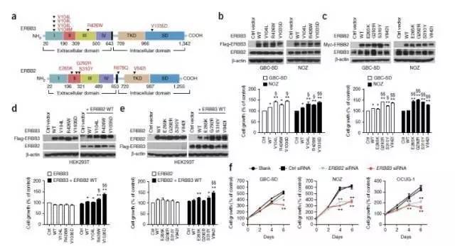 图1: Somaticalterations of ERBB3 and ERBB2 and their oncogenic effects on normal and GBCcells.(摘录自2014年Naturegenetics)