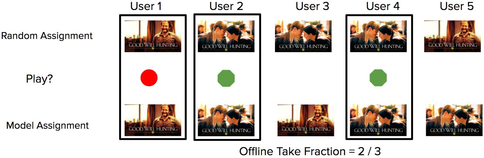 在这个在线学习设置中,我们通过训练上述的情境式拉霸,让它们为每个用户选择最好的封面图。通常每个影片最多有几十个候选封面图,为了学习模型选择,可以通过在各个影片中为每个成员独立地进行封面排名,实现这一过程的简化。即使有了简化,我们还是能够了解用户的偏好,因为对于每张候选封面图,总会有看到之后喜欢上它的用户,也有不喜欢的用户。然后可以对这些偏好建模(每组都含有成员、标题、图像),最后可以得到用户接受高质量图片的概率。这些也可以用监督式机器学习模型完成,或带有Thompson Sampling、LinUCB和贝叶斯分类的情境式拉霸,从而得到最佳预测与数据探索。