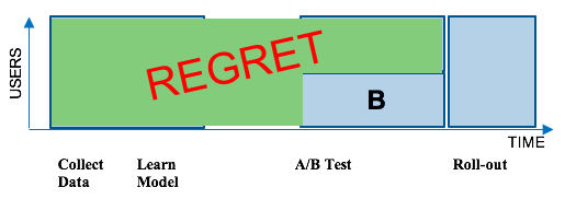 Netflix大部分的推荐机制都采用机器学习算法。以前我们会收集一批注册会员如何使用服务的数据,然后用这批数据训练一个新的机器学习算法。接下来用A/B测试法在当前的生产系统上测试这种新算法。A/B测试通过在随机子集上运行,可以让人们了解新算法是否比现有的生产系统更好。A组最终获得生产经验,B组获得新的算法。如果B组中的用户更喜欢泡在Netflix上,那么网站就会把这个新算法推广到整个用户群体。但不幸的是,这种处理方式产生了后悔(regret):长期以来,许多用户并没有体验到更好的服务。下图展示了这一过程: