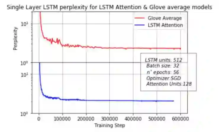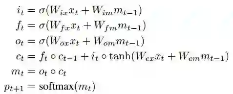 其中 f 是遗忘门,i 是输入门,o 是输出门,m 是存储器输出,W 是可训练矩阵。单词预测是通过输出词汇表中每个单词的概率分布的 softmax 层进行的。