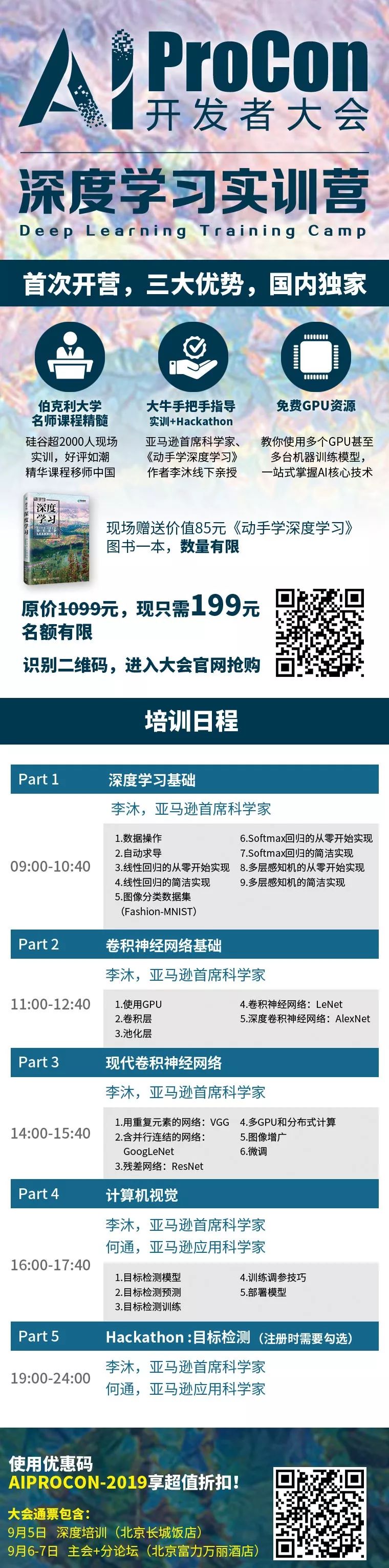 9 月5 日,下周四,大家期待已久的由《动手学深度学习》作者,亚马逊首席科学家亲自带领的「深度学习实训营」就要在北京开营了。