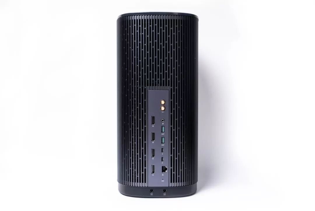 PA90 左右两侧与背面均为 CNC 金属栅格,机身左侧为 CPU 散热,右侧则是显卡的散热,与 Mac 合多为一不同,属于分仓散热设计再将热量由顶部排出,背面则是I/O接口区域。