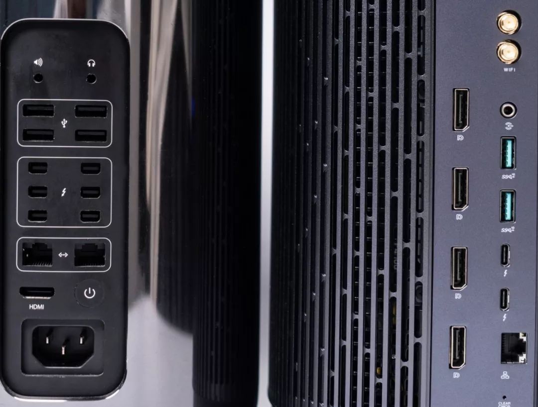 而老款 Mac Pro 这边则是音频接口,4 个 USB 3.0 接口,6 个雷雳 2 接口,2 个 RJ45 网线接口,一个 HDMI 接口,对比起来看老款 Mac Pro 好像还宝刀未老,但毕竟是 6 年前的产物,雷雳 2 接口虽有 6 个,但带宽仅为雷雳 3 的二分之一,拓展性能和设备支持在如今也大打折扣。