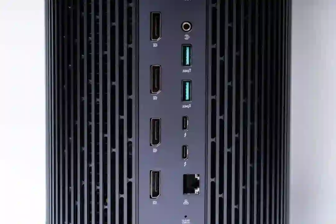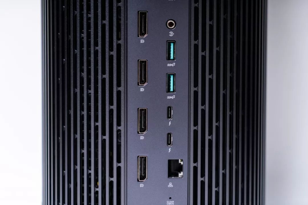 PA90 背面拥有 4 个 DP 1.4 视频输出接口、2 个 USB 3.1 接口、1 个 RJ45 网线接口、1 个音频输入接口、2 个 WiFi 天线接口和两个满速雷雳 3 接口,RJ45 网线接口下方还有一个清空 CMOS 的针孔,再加上正面两个 USB3.1 接口和两个音频接口,可以说拓展接口相当充足,还能满足同时接驳 6 个显示器同时输出的需求,用于应对各种多媒体创作场景应该是不成问题了。