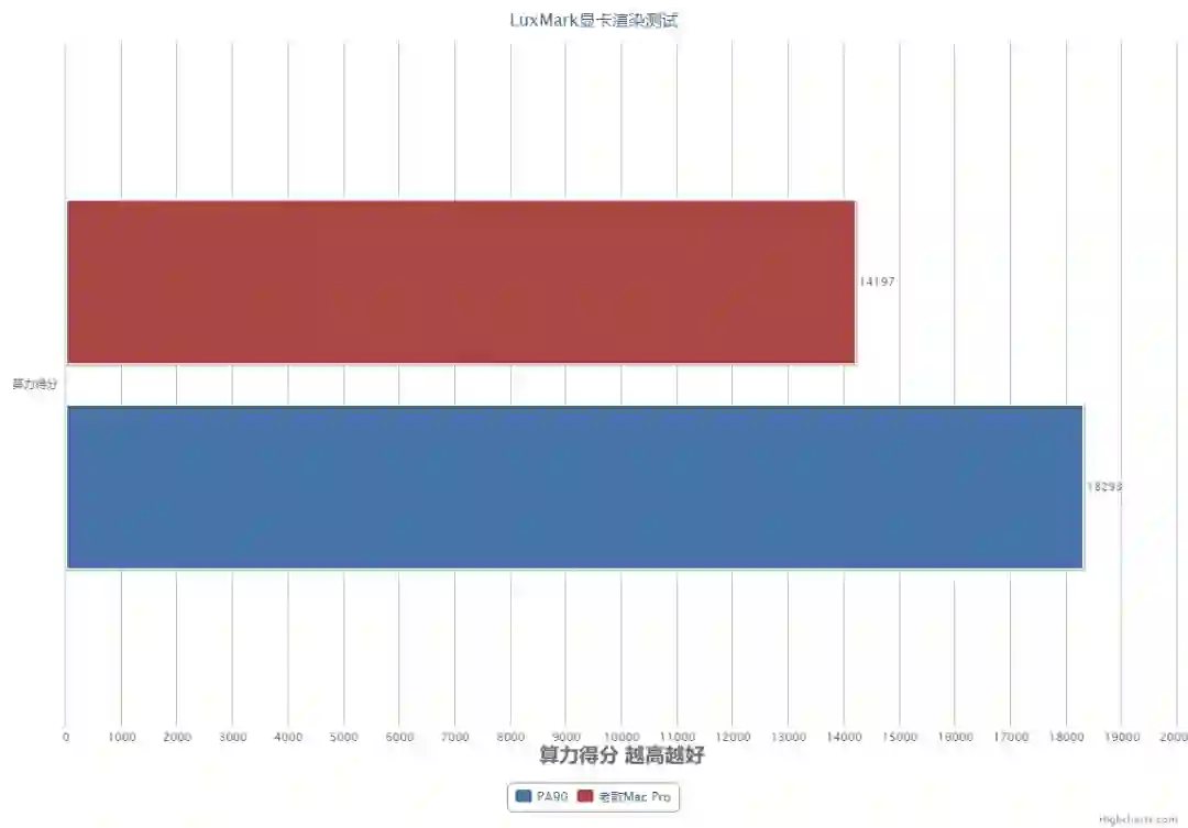 因为无法模拟出新款 Mac 显卡,所以显卡测试上只能和旧款做对比了,这 款Mac Pro 采用的是双 AMD FirePro D300 图形处理器,各配备 2GB GDDR5 显存,而 PA90 配备的是英伟达 QUADRO P4000 专业显卡,配备了 8G GDDR5 显存,专业显卡的使用场景中,计算任务对显存的需求可以是无限大,所以显存大小就要根据成本和显卡核心计算能力上限来定了,但一般会大于游戏显卡;