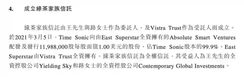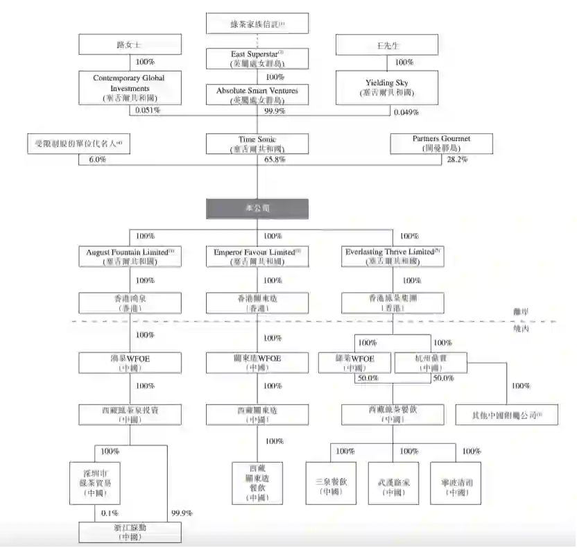 创始人路妍(路长梅)曾在2014年采访中,对媒体道出100亿规模的野心,以及接受融资的前提是,让员工做老板。绿茶成立14年来,唯一的外部投资者为合众集团(Partners Gourmet)。2017年,合众集团用了约7063.1万美元向王路夫妇控股的Time Sonic购买购买绿茶股份,当时占股30%,绿茶61家餐厅,估值2.35亿美元(约16亿元)。通过这笔交易我们可以看到,王勤松路长梅夫妇已身家10亿起。合众集团是一家来自瑞士的私募集团,至今已投资了近十余家中国本土基金,其中包括鼎晖、弘毅、今日资本、赛伯乐等。投中网曾统计,其2021年通过项目退出获得290亿美元收入(2020年:120亿美元)。合众集团曾在2015年底战略融资母婴产品零售商相关服务提供商爱婴室,而爱婴室于2018年在上海证券交易所上市(股票代码:603214)。但事实上,员工并没有成为绿茶的老板,反而家族企业基因愈发浓重。连锁餐饮集团大多是夫妻买卖,如海底捞、杨国福甚至捞王,绿茶也不例外。绿茶则是围绕王勤松、路长梅夫妇的家族生意。三名执行董事,分别是王勤松、路长梅弟媳于丽颖、以及王勤松侄子王佳伟。2020年,绿茶亏损5500万,其中拿到了政府补贴2311万元。执行董事于丽颖年薪370万,王佳伟170万。绿茶集团结构甚至,这对夫妇还设立了家族信托,分散风险、资产保值。王路夫妇将自己控股的Time Sonic 99%分别转移到王勤松的Yiedling Sky(占比49%)及路长梅的Contemporary Global Investments(占比51%)。绿茶成立家族信托或许是因为经历了从巅峰跌落为平常,绿茶家族开始未雨绸缪,提早进行财务规划。