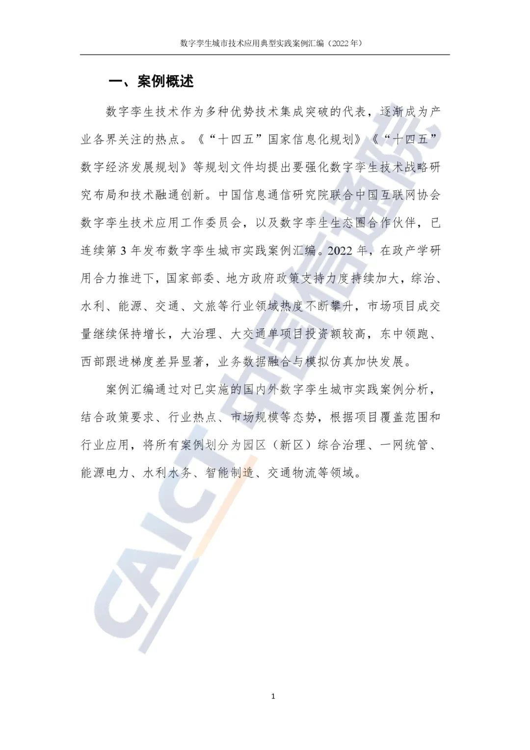《案例汇编》通过对国内外已实施的数字孪生城市实践案例分析,结合政策要求、行业热点、市场规模等态势,根据项目覆盖范围和行业应用,将遴选出的案例划分为园区(新区)综合治理、一网统管、能源电力、水利水务、智能制造、交通物流等领域,并择优选择16个典型案例,以期为国家及地方政府推动数字孪生应用建设提供有力借鉴。