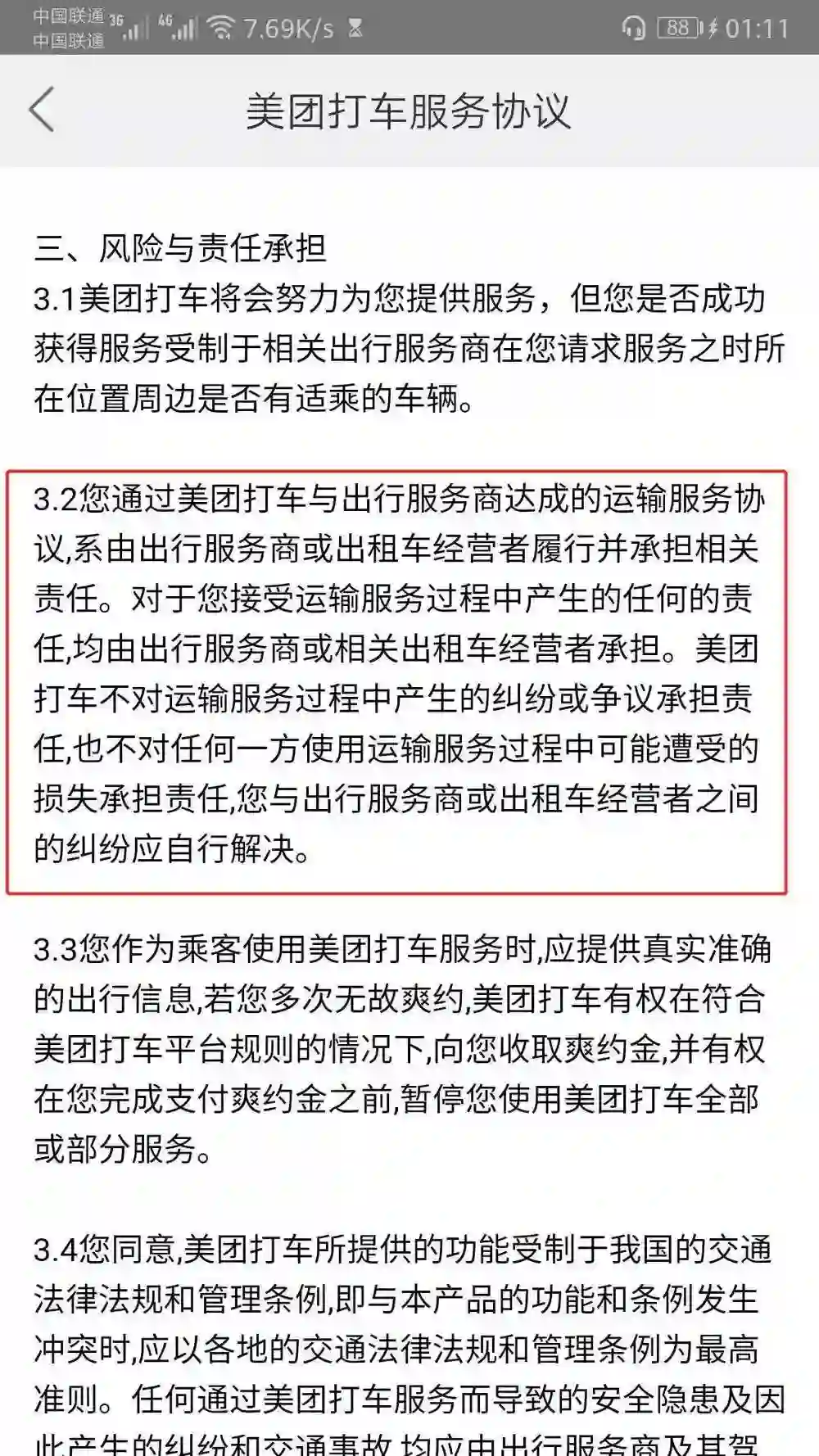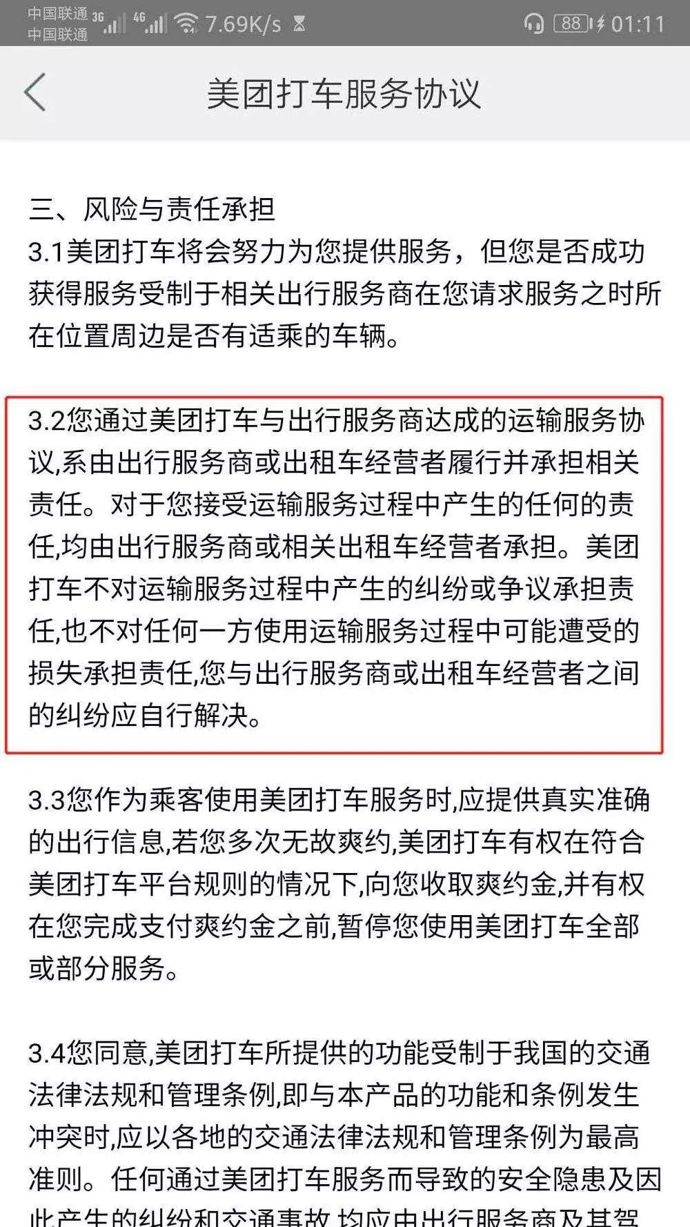 “美团打车不对运输服务过程中所产生的纠纷或争议承担责任,也不对任何一方使用运输服务过程中可能遭受的损失承担责任,乘客与出行服务商或出租车经营者之间的纠纷应自行解决。”