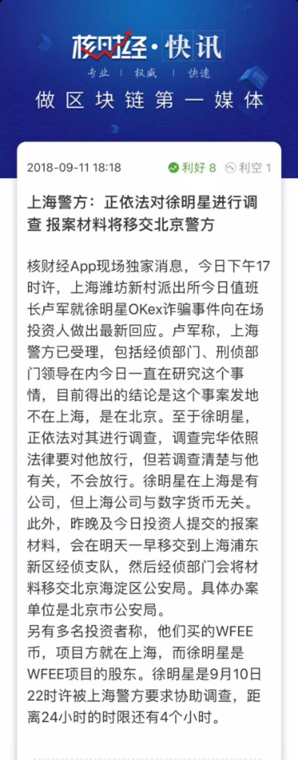 OKcoin创始人徐明星10日晚间被带入派出所,而最新的消息是:上海警方称目前正依法对徐明星进行调查,报案材料将移交北京警方。