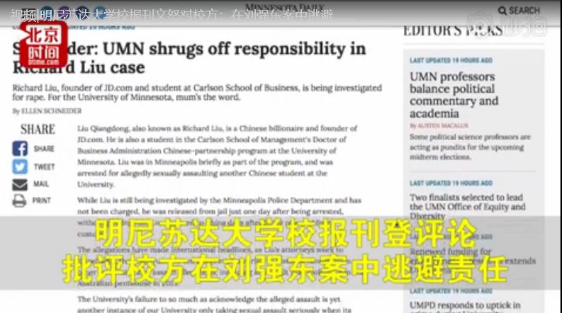 当地时间9月10日,明尼苏达大学校报刊文批评校方不作为。文章称,刘强东案校方至今未有正式声明,只把一切责任推给警方,证明校方根本不在乎学生安全。
