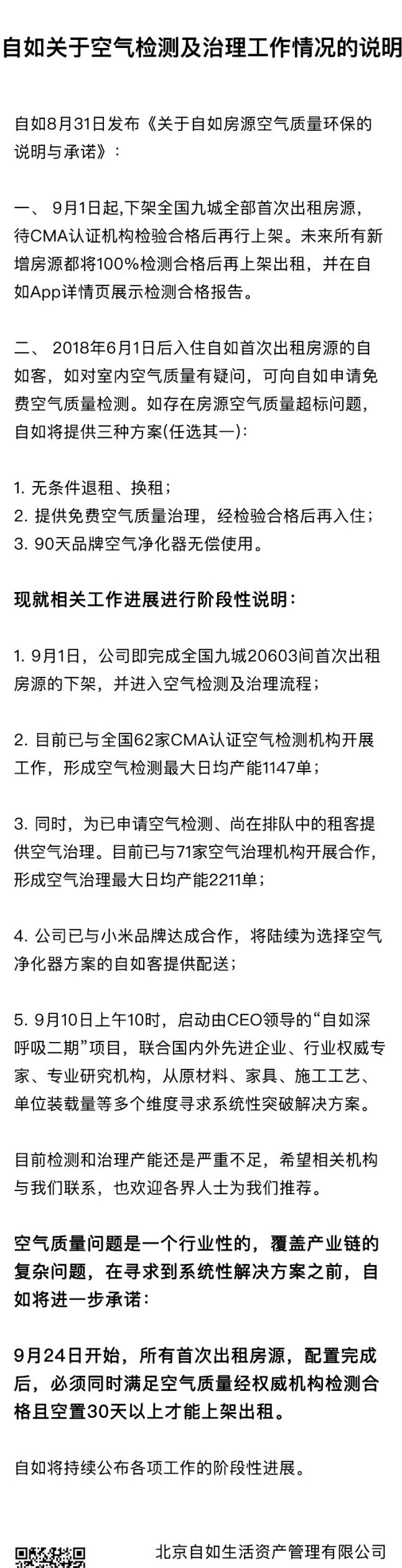 今天自如在其微博上发布了关于空气检测及治理工作情况的说明。大概是:自9月1日起,自如已经完成全国九城20603间首次出租房源的下架,并进入空气检测及治理流程;目前已与全国62家CMA认证空气检测机构开展工作,形成空气检测最大日均产能1147单。