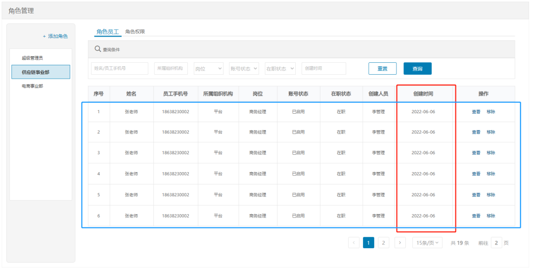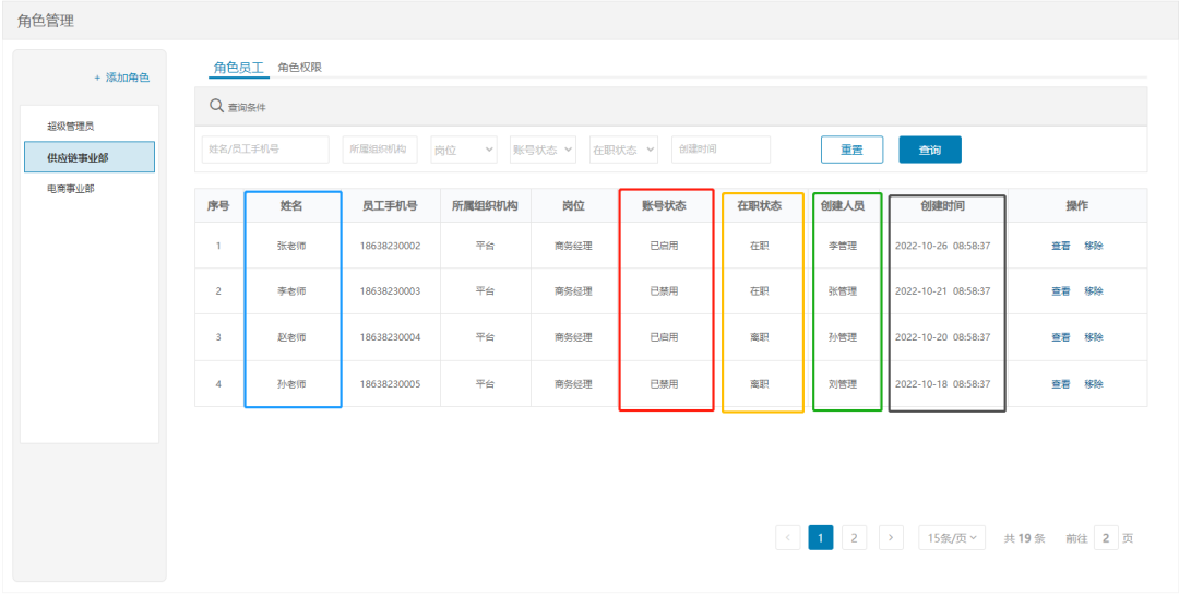 二是,列表展示完全体现不出来业务逻辑,关键的状态并没有做区分,如,“已禁用”的账号状态缺失、在职状态包括“在职”、“离职”也没有体现,仅仅是单纯的复制行数,让页面显得饱满而已,背后的业务逻辑和设计思维都没有体现。