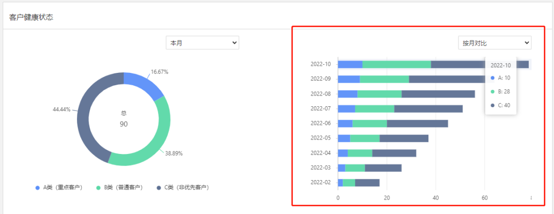 上周,我们团队一个产品同学在做CRM的数据统计的原型设计,其中有个功能是“客户健康状态”的堆叠条形图,希望能直观展示客户健康情况。