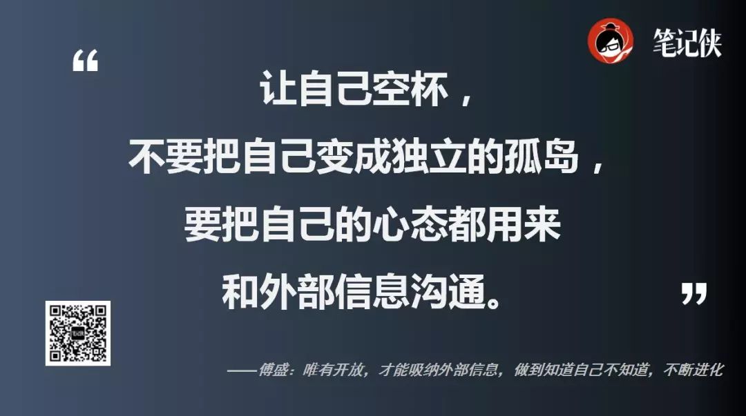 这个时代最主要的是“开放”,我本来用的是谦逊,后来担心不太好懂,改成了开放,总而言之是让自己空杯,不要把自己变成独立的孤岛,要把自己的心态都用来和外部信息沟通。