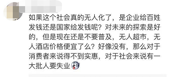 面对阿里首家“无人酒店”的开业,众多网友也是发表了看法,不少网友都表示,如果这种模式真的成功,又要有多少人失业?