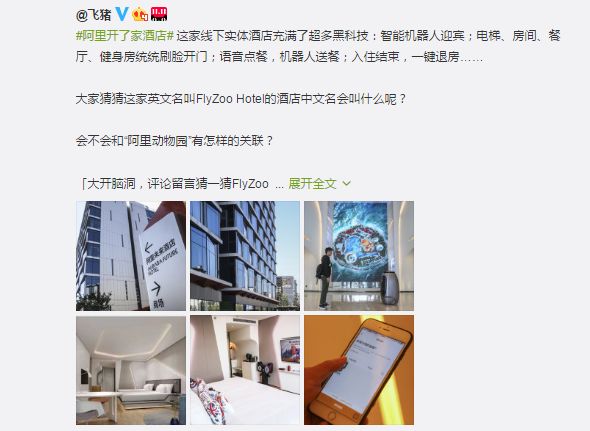 10月29日,飞猪在其官博宣布阿里开了一家名为“FlyZoo Hotel ”的酒店,结合了“飞猪”的意译和音译,中文名“菲住布渴”,显然是结合了“飞猪”和“非住不可”的谐音。