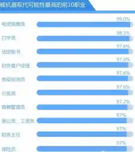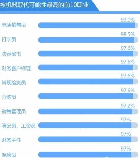 据《21世纪商业评论》报道,英国广播公司(BBC)依据被机器代替的可能性对职业进行了排序,被取代可能性最高的职业是:电话销售员、财务客户经理、检测员、保险员等;被取代可能性最低的职业是,中等教育教学人员、心理师、治疗专业人员、酒店和住宿经理等。