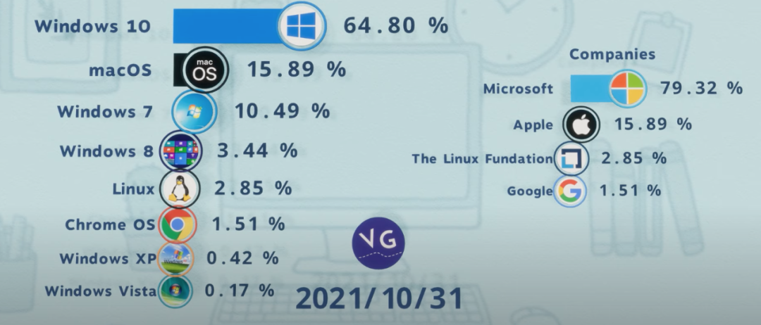 全世界范围内的开源运动浩浩荡荡,滚滚向前。Linux 内核作为开源软件中的杰出代表,在云计算、服务器端、 智能手机端、嵌入式系统中的成功举世公认。截止 2021 年底,Linux 在服务器领域占据了 96%的市场份额,在超级计算机领域几乎占领了全部市场,在云计算基础设施领域占据了 90%的市场份额,在智能手机领域也占有 85%的市场份额。现今,在人们日常的工作和生活中,Linux 内核几乎无处不在。但与此相反的,则是 Linux 桌面系统地位不断下滑。据统计,长期以来,Linux 桌面系统的市场份额徘徊在 2%左右,而原来被微软 Windows 压得喘不过气来的 macOS 系统,却在近几年取得了不小的进步,获得了超过 10%的市场份额。