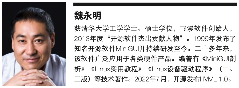 在我所开发的 MiniGUI(开源 Linux 图形用户界面支持系统)生意受到 Android 冲击之后,我带领团队转战移动互联网以及智能硬件,开发过很多网站和智能手机应用。几年前,随着美国打压中国高科技产业愈演愈烈,国家又开始重视基础软件的自主可控,MiniGUI 的生意又回来了,我们也帮着一些客户开发了基于 MiniGUI 的解决方案。但由奢入俭难,习惯了网页前端开发技术的便利性,作为开发者,我们自己都难以接受使用 C/C++这样的编程语言来编写带有图形用户界面的应用程序——我发现使用 C/C++这类编程语言开发带 GUI 的应用,跟用牛刀杀鸡并无二致;就算有可视化的界面设计器帮助开发者,其开发效率也很难和 Web 前端技术相比。