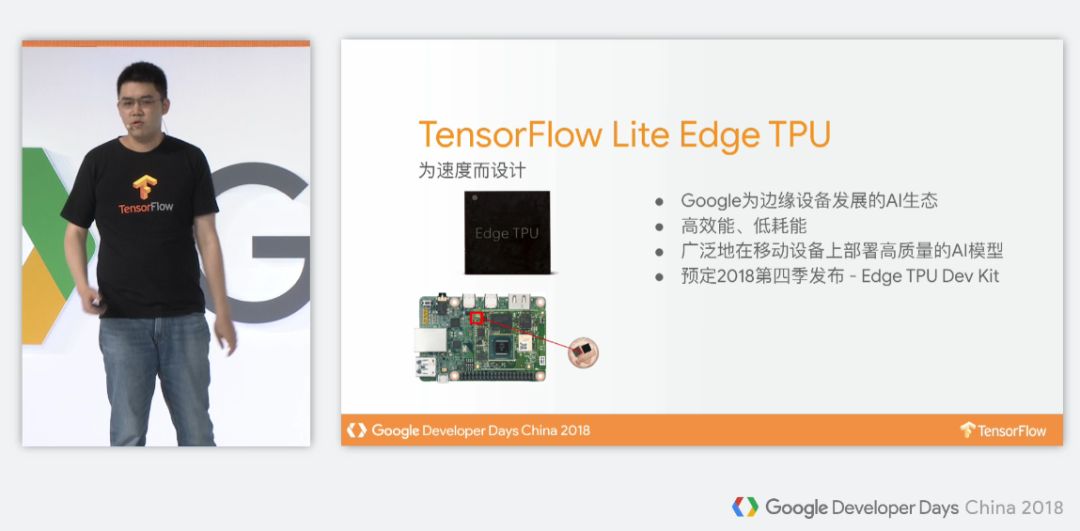 在TensorFlow Lite介绍演讲中, 谷歌多次提到了自家的硬件加速器——Edge TUP。众所周知,TPU是专为TensorFlow等机器学习应用打造,能够降低运算精度,在相同时间内处理更复杂、更强大的机器学习模型并将其更快投入使用。演讲现场,谷歌更是透露 TensorFlow Lite Edge TUP 预定2018年第四季度发布。