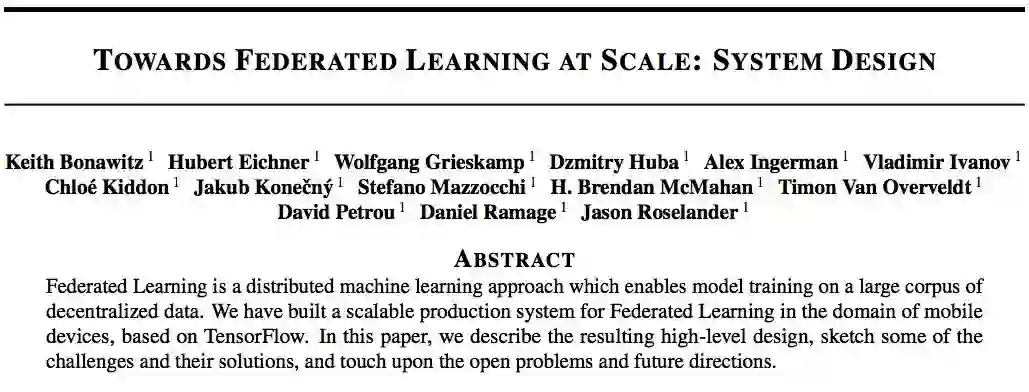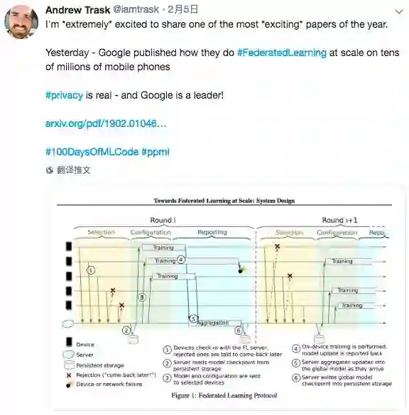 Andrew Trask说的,是谷歌日前在arxiv贴出的论文,“Towards Federated Learning at Scale:System Design”,论文描述了前面所说的全球首个产品级可扩展的联合学习系统,以及该系统的高级设计和一些挑战及其解决方案。