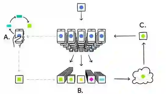 联合学习能产生更智能的模型,更低的延时和更少的功耗,同时确保用户的隐私。过程示意:(A)手机在本地根据你使用手机的方式将模型个性化,(B)许多用户的更新会集中起来,(C)在云端形成针对一个共享模型的协同更新,然后不断重复这个过程。来源:Google Blog